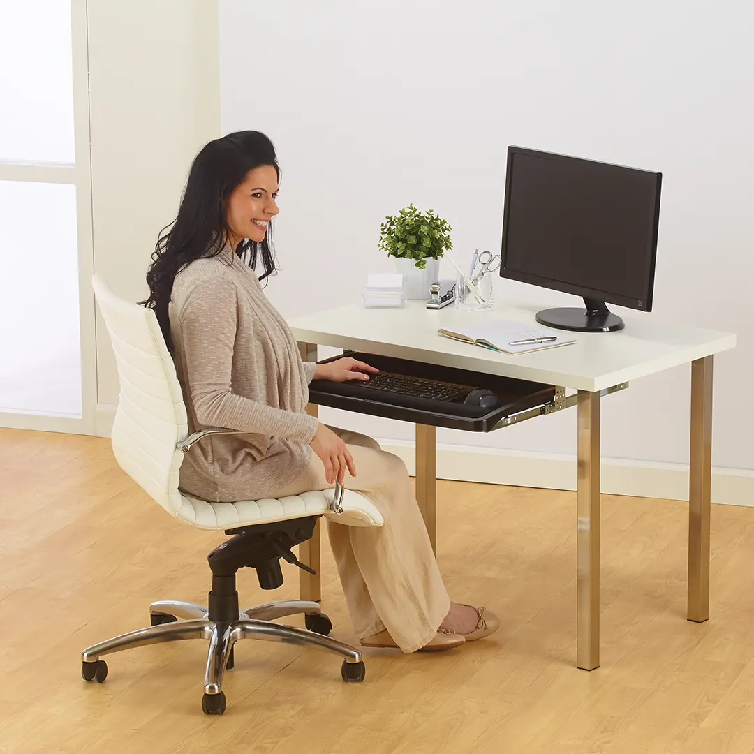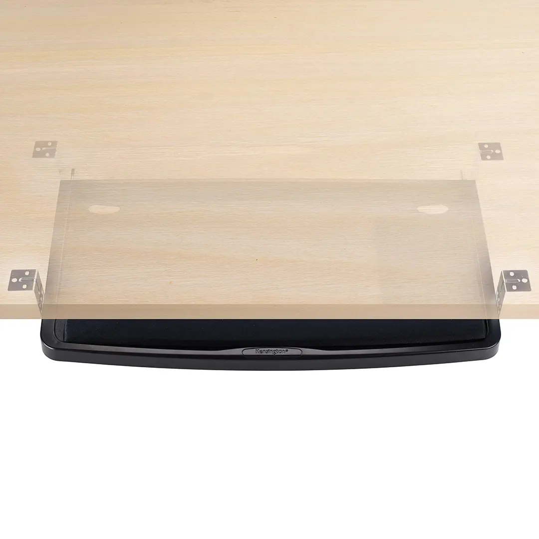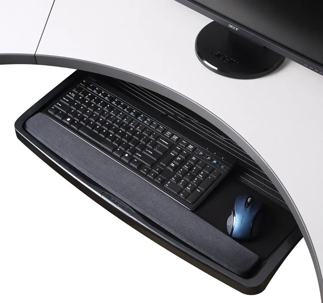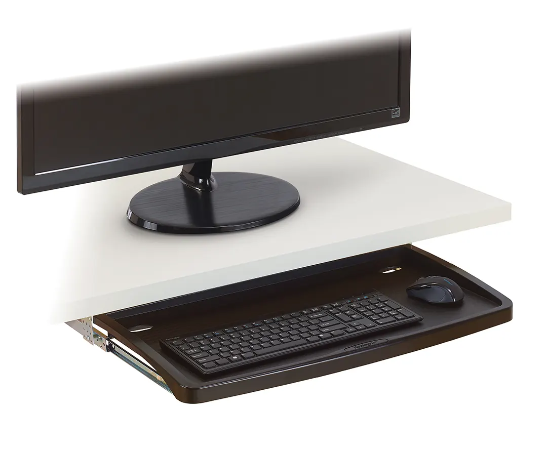 Espacio libre en el escritorio con bandeja deslizable para teclado y mouse debajo del escritorio.