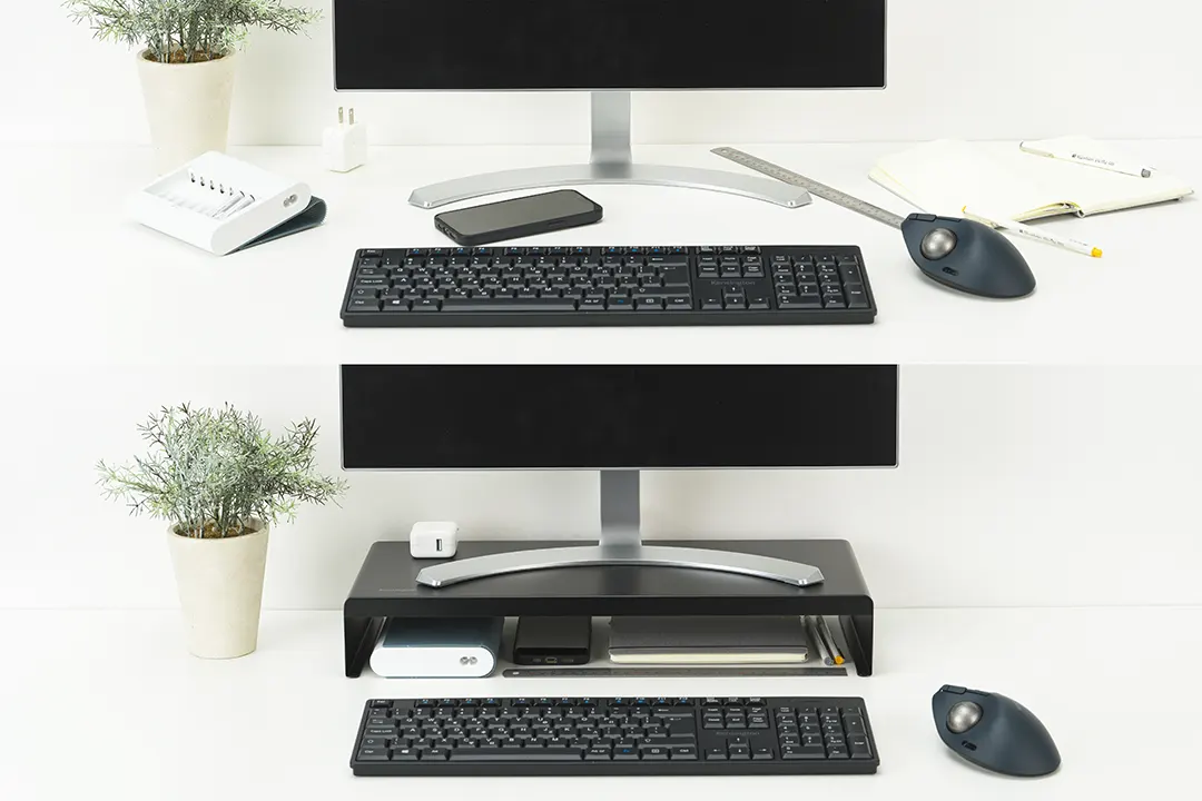 La base de acero para monitor extra larga permite a los usuarios levantar su monitor a una altura de visualización más cómoda y reducir el desorden en el escritorio. La base de construcción sólida eleva los monitores 8 cm (3,2”) para un mejor uso en la línea de visión, lo que puede ayudar a reducir la tensión en los ojos y el cuello, promoviendo una postura saludable. El amplio espacio de almacenamiento debajo permite a los usuarios guardar un teclado u otros periféricos. Construída con acero resistente y duradero, es lo suficientemente resistente como para soportar monitores de hasta 34” y 20 kg (44 lbs). Para garantizar un uso seguro, la base del monitor del usuario debe ser más pequeña que las dimensiones de la superficie del soporte de 50 cm x 20 cm (19,7” x 8”).