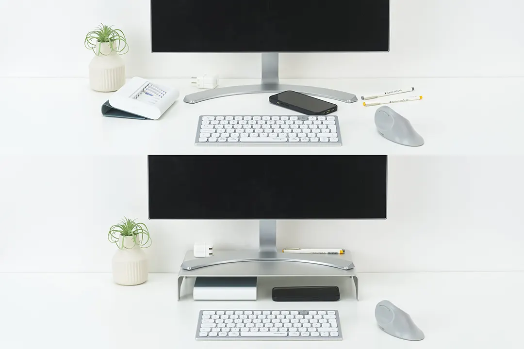 Cuando se usa un monitor en el escritorio sin soporte, puede ser demasiado bajo para la comodidad del usuario. Con la base de aluminio ultradelgado para monitor, los usuarios pueden elevar su monitor a una altura de visualización más cómoda y reducir el desorden en el escritorio. Construido con aluminio liviano, esta base de construcción sólida es lo suficientemente resistente como para soportar monitores de hasta 34” y 9 kg (19,8 lbs). El espacio libre debajo del soporte proporciona espacio adicional para almacenamiento. Para garantizar un uso seguro, la base del monitor del usuario debe ser más pequeña que las dimensiones de la superficie del soporte de 40 cm x 21 cm