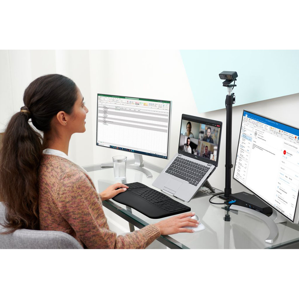 videoconferencias organizada y profesional. El soporte con altura regulable, la base giratoria de 360° y los clips de organización de cables favorecen un espacio de trabajo productivo y ordenado.