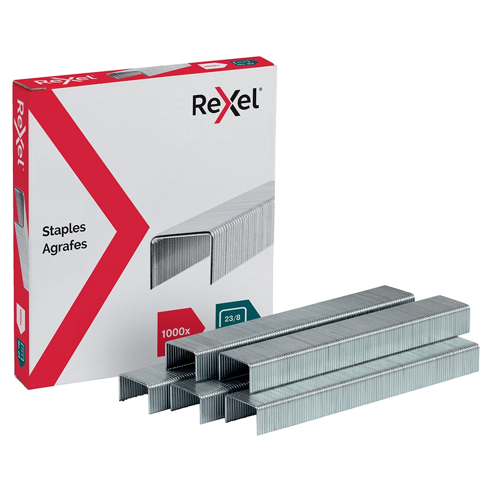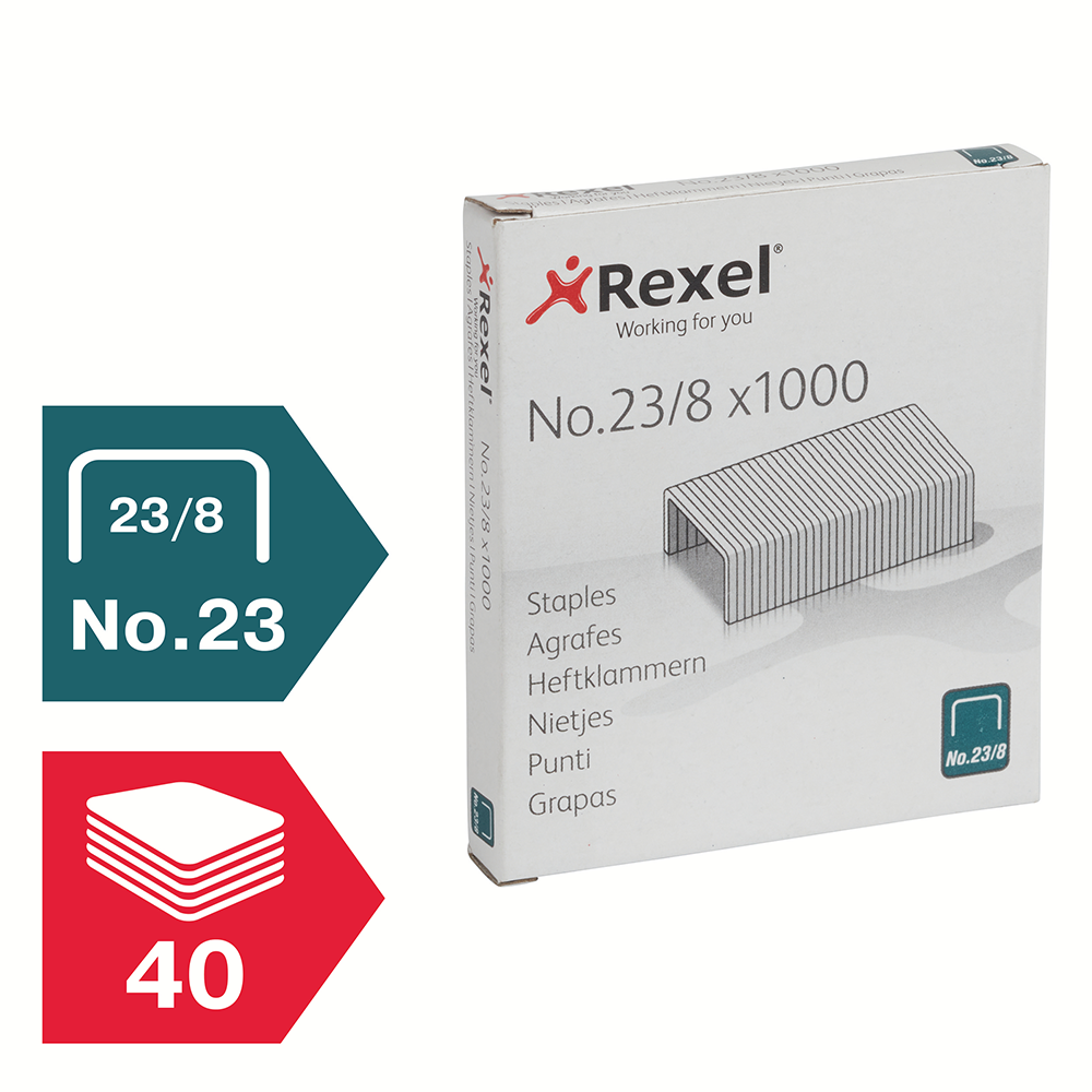 Organice sus documentos.Corchete de alambre acerado Nº23/8 mm de Rexel® ofrece un óptimo resultado de forma fácil y segura.