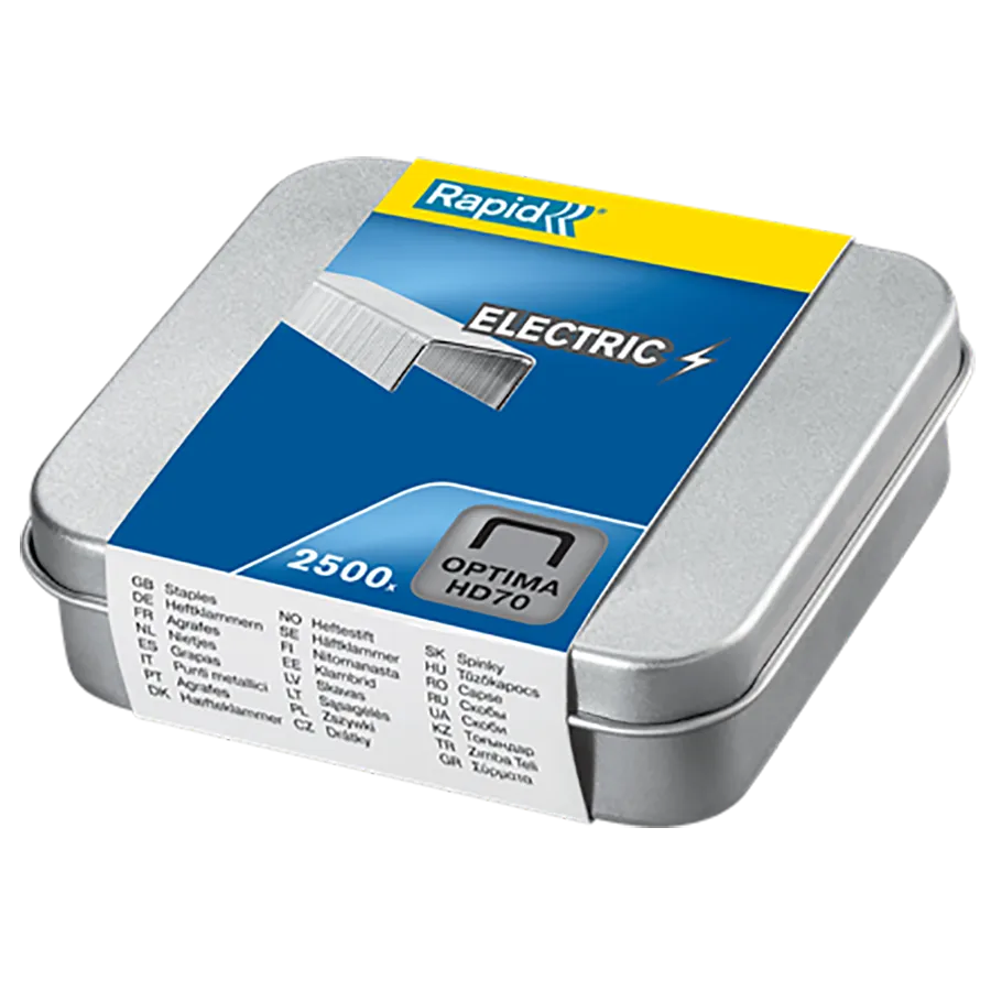 Fabricadas con acero de alta calidad, los corchetes Optima HD70 tienen unas patillas más largas y con puntas extremadamente puntiagudas para penetrar fácilmente en documentos de hasta 70 hojas y garantizar un funcionamiento sin atascos al utilizar las corcheteras eléctricas de Rapid Optima 45 y Optima 70 y Optima 60E. Disponibles en paquetes de 2500. Presentadas en una ingeniosa lata de aluminio con tapa de seguridad.