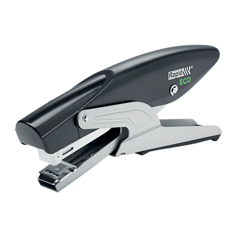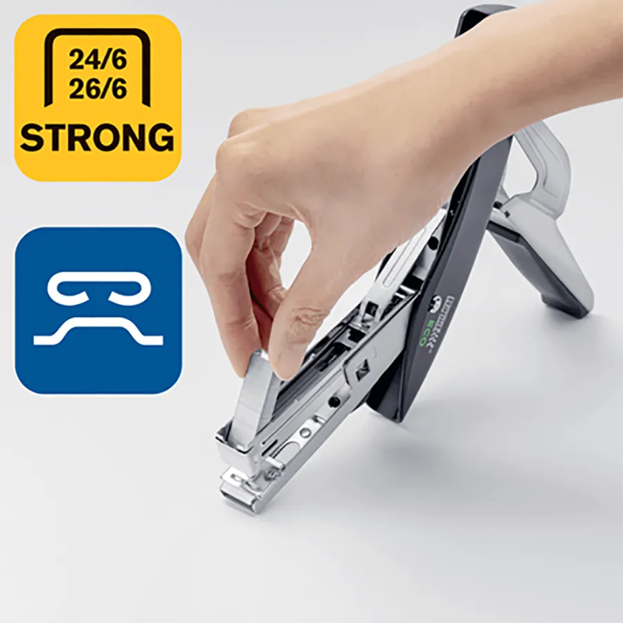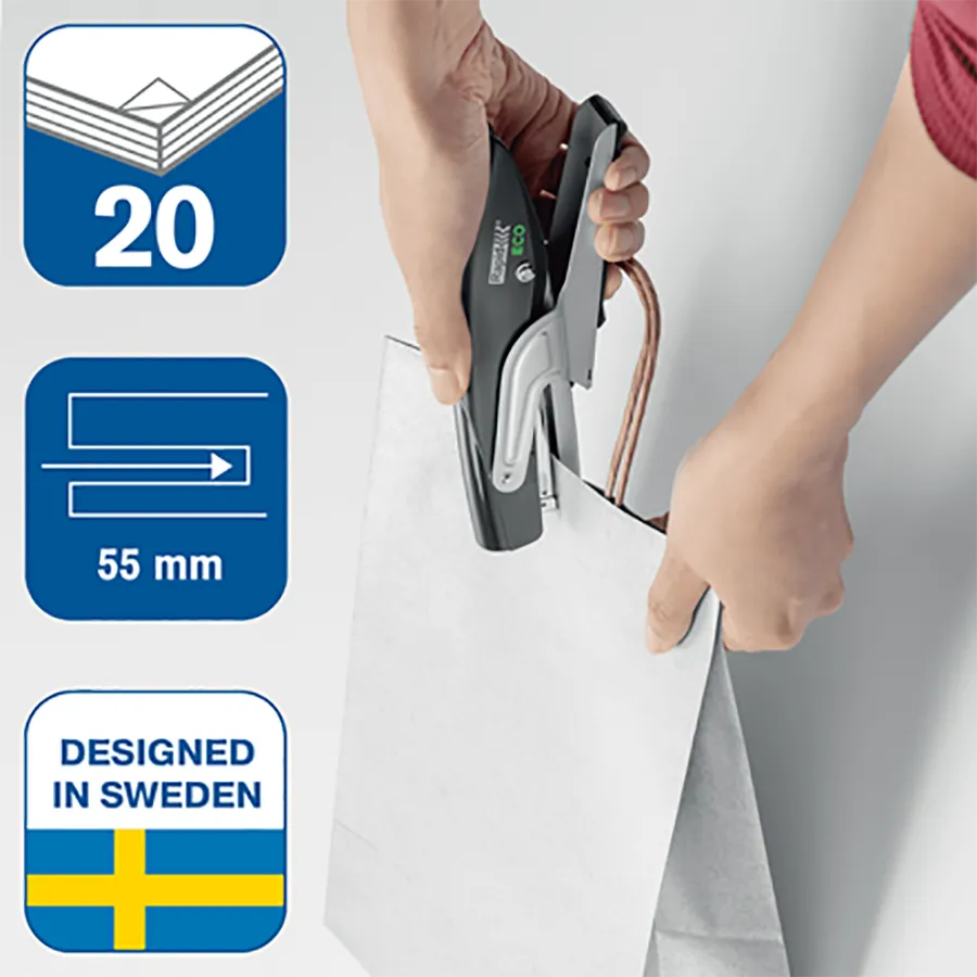 - Corchetea hasta 20 hojas de papel (80 g/m²). - Fabricada con un 81% de plástico reciclado (ABS reciclado postconsumo). - 100% reciclable desmontando completamente la cochetera. - Recarga rápida y sencilla de corchetes con el mecanismo de recarga de car
