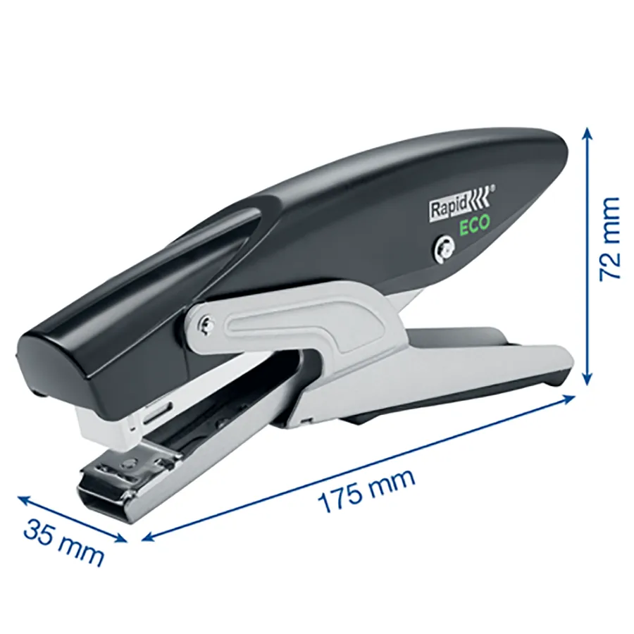 Color Negro Material Plástico ABS reciclado / Metal Dimensiones 35 x 72 x 175 Capacidad de corcheteado 2.5 mm/20 hojas (papel de 80 g/m²) Tipo de corchetes Rapid 24/6 y Rapid 26/6 Tipo de corcheteado Clavado y corcheteado Profundidad entrada papel 55 mm Carga superior