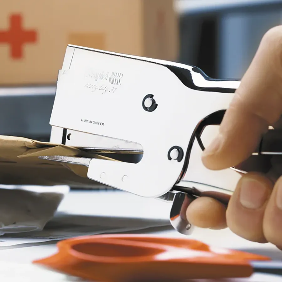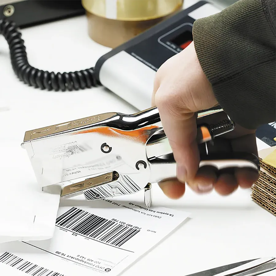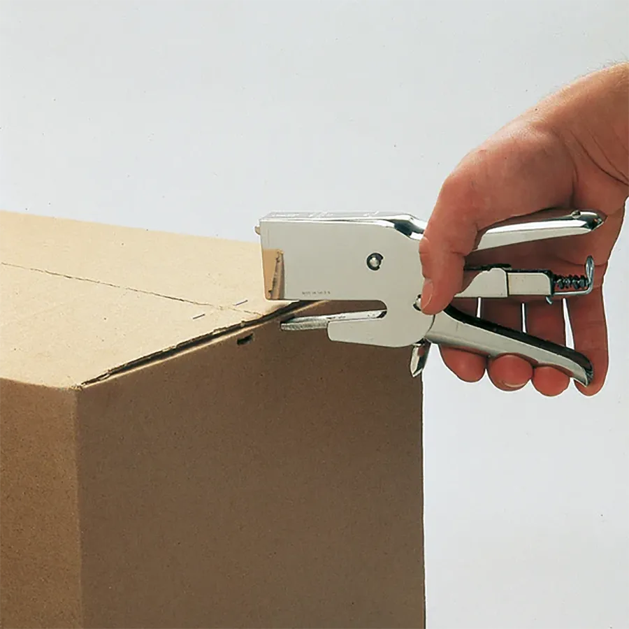 Potente corchetera de tenaza niquelada con tope de parada. Ideal para sobres acolchados, cajas pequeñas, etc. Funciona con 2 yunques diferentes, que se acoplan fácilmente con 2 tornillos. Ideal para servicios postales, oficinas y almacenes.