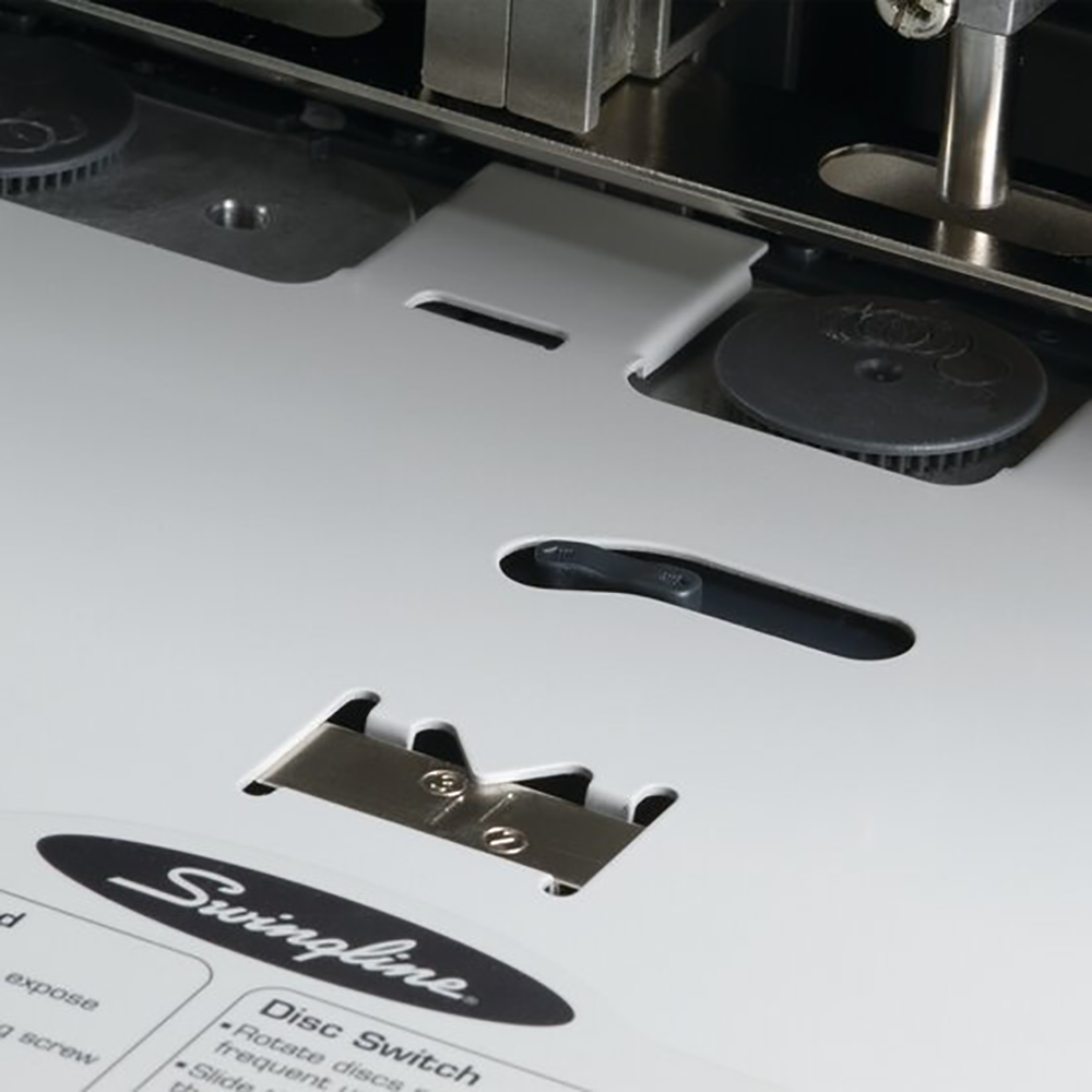 Capaz de perforar agujeros de 9/32" o 11/32". Hay disponibles kits de cabezales perforadores de repuesto. GuÃa de papel ajustable y bandeja de virutas extraÃble.