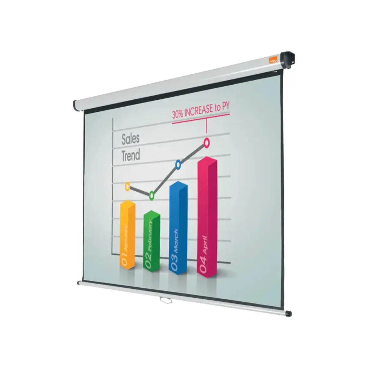 Telón Mural 4:3 86” (175 x 132 cm) NOBO posee una superficie blanca mate en la pantalla que reproduce imágenes con gran nitidez y detalle, visibles desde cualquier punto.