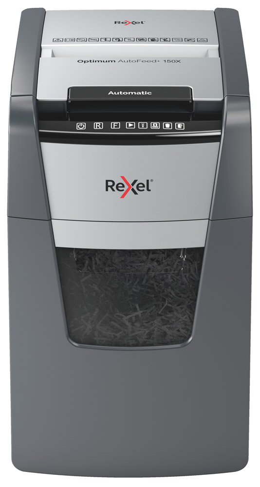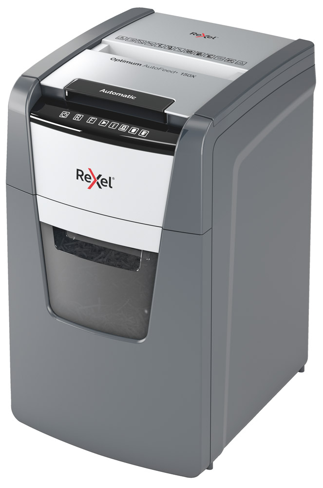 La destructora de corte en partÃculas Optimum AutoFeed 150X tritura automáticamente hasta 150 hojas de papel A4 (80 grs.) a la vez, en partÃculas P-4 (4×28 mm).
