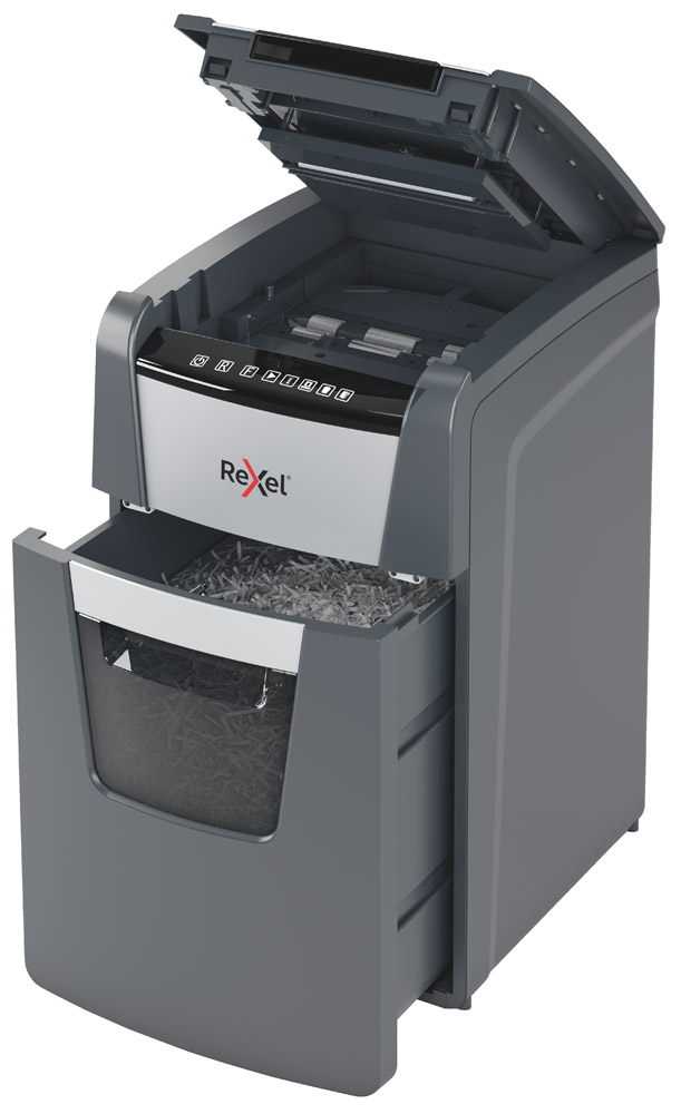 Esta destructora de alimentación automática es una trituradora de oficina sofisticada, con una papelera extraÃble de 44 litros.