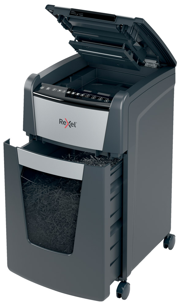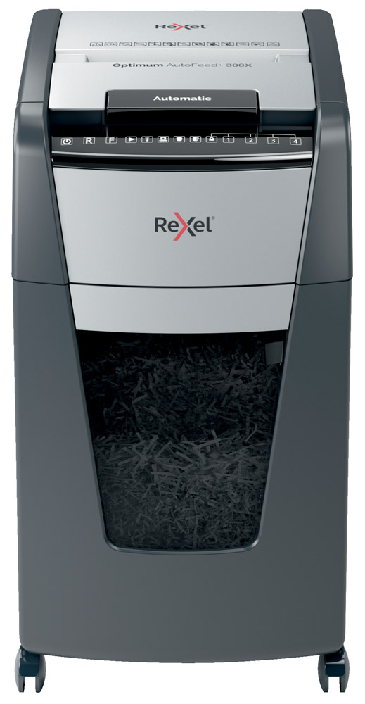 La destructora de corte en partÃculas Optimum AutoFeed 300X tritura automáticamente hasta 300 hojas de papel A4 (80 grs.) a la vez, en partÃculas P-4 (4×25 mm).
