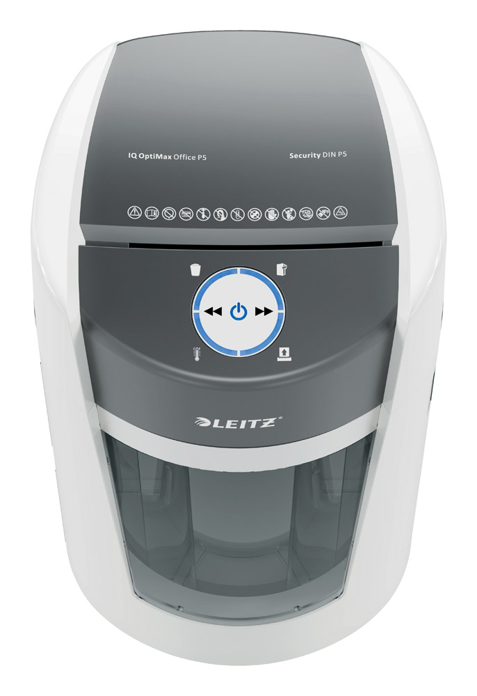 La destructora de documentos Leitz IQ OptiMax Office ofrece una solución de destrucción innovadora y elegante, al tiempo que garantiza una seguridad y tranquilidad excepcionales. Esta destructora de papel DIN P5 de alta seguridad tritura sin esfuerzo hasta 10 hojas A4 a la vez en microcortes. La IQ OptiMax incorpora la exclusiva tecnologÃa de giro de papelera (BRT), que maximiza la capacidad en un +33%*. La papelera giratoria garantiza una distribución plana y uniforme del papel para evitar que los trozos de papel formen un pico en la papelera, lo que permite triturar 140 hojas A4 adicionales antes de tener que vaciarla. BRT significa que no hay necesidad de sacar o agitar la papelera; el indicador de “papelera llena” solo se activa cuando alcanza el 100% de su capacidad. La generosa papelera de 35 litros tiene capacidad para 550 hojas A4 y se ilumina en azul durante su uso para ofrecer la mejor experiencia de destrucción. La intuitiva pantalla LED giratoria incluye indicaciones de advertencia en rojo para diversos estados, como papelera llena y puerta abierta. La Leitz IQ OptiMax es versátil para cualquier entorno de trabajo gracias a su funcionamiento ultrasilencioso, su diseño elegante y su impresionante durabilidad. AutonomÃa continua de 120 minutos. Color blanco. *La Leitz IQ OptiMax probada con y sin tecnologÃa de giro de papelera.