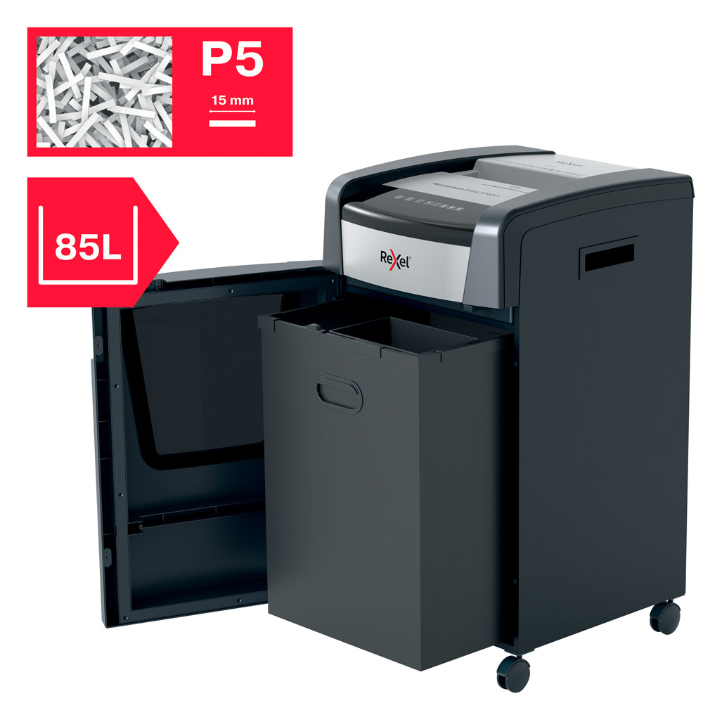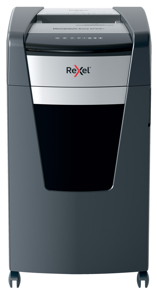 Las destructoras de papel sin atascos Rexel Momentum Extra son ideales para destruir documentos confidenciales en la oficina. La destructora XP516+ destruye hasta 18 hojas de papel A4 (80 grs) de una sola vez a través de la ranura de alimentación manual en partÃculas P-5 (2x15mm). La tecnologÃa de detección activa mide el número de hojas que se alimentan en tiempo real para detener los atascos y los errores de alimentación del papel; se indica mediante un LED rojo en el panel de control. Esta destructora de papel no funcionará hasta que el número de hojas se reduzca por debajo de la capacidad máxima de hojas o la alcance. Esta destructora de papel de alta resistencia también destruye tarjetas de crédito,corchetes,clipsy CDs/DVDs. Tiempo de funcionamiento continuo con refrigeración porventiladory modo ECO para ahorrar energÃa cuando no se utiliza. Máxima amplitud de entrada (mm): 230.Esta destructora de corte en partÃculas está diseñada para un uso moderado o intenso gracias a su gran capacidad de hojas, su gran papelera de 45 litros y su tiempo de funcionamiento continuo. No es necesario quitar primero las grapas y los clips; esta destructora de Rexel también destruye de forma segura CD, DVD y tarjetas de crédito a través de una ranura de alimentación independiente.